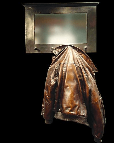 Hanson chooses to isolate and immortalize a man's leather jacket. The choice becomes a comment on the power in our culture of image per se. A comment on the ascendence of personal style and image, via our possessions and fashion, to a consuming culture value. Seemingly casually tossed over a hook, yet frozen there in bronze, the jacket evokes an entire range of masculine stereotypes celebrated by the media-cowboys, mavericks and rebels of our time. The open road, macho bravado, rugged individuality, sex appeal. Yet the pesence of this lone jacket equally evokes the very personal, if anonymous, history of its wearer. Like the cast-form-life sculpture of George Segal, it expresses mystery, even poignancy, of its owners absence. As in much of Hanson's art, this culture manages both to critique and also to value such material icons of our culture.