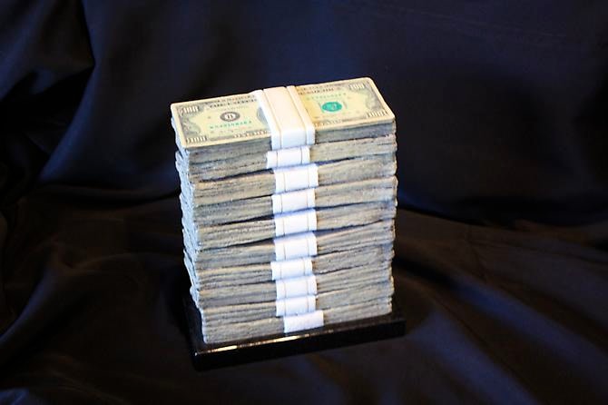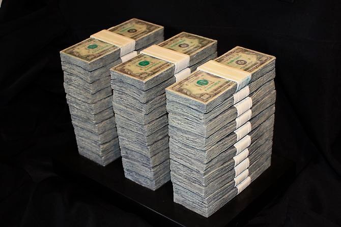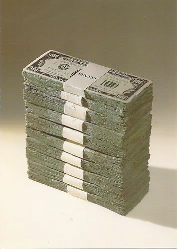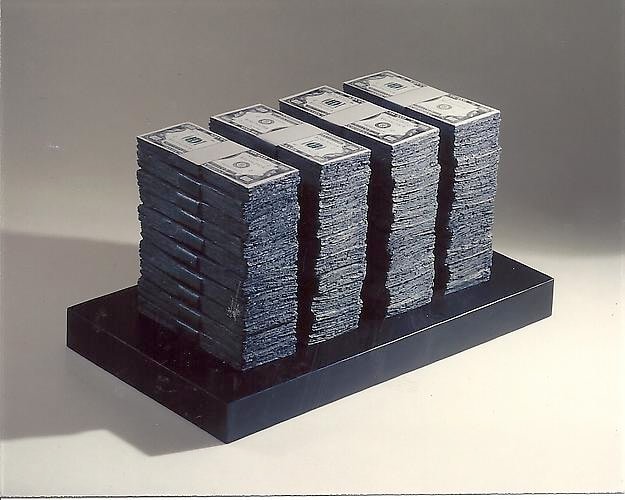 Hanson's meticulous recreation-again, through painstaking casting techniques-of an imposing pile of neatly-tied bundles of bills is his most head-on critique of contemporary vales. It is also his most daringly literal embodiment of them. Going one better than PoP Art's consumer objects as subjects-fast food and brand names-Hanson gives 3D visual form to the medium itself of consumerism: hard cash. This work dovetails with Post-modern critique of art itself turned commodity (eg Jenny Holzer, Louise Lawler, Allan McCollum). The stack of bills suggest the extravagant sums, the investment value, associated with the work of art. Here, the market value of art replaces and even becomes the image itself, simultaneously seducing the eye while critiquing the system.